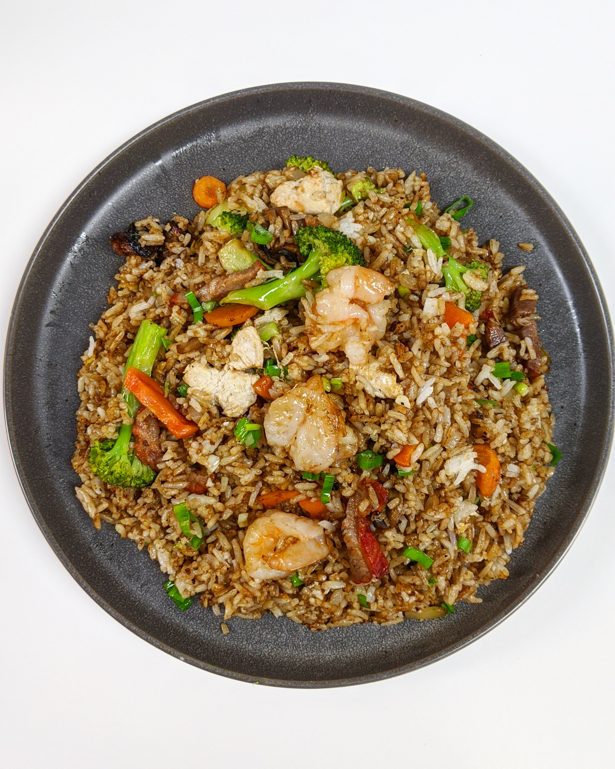 A Medley of Shrimp, chicken, BBQ Pork, broccoli, Mushrooms, Carrots, peas