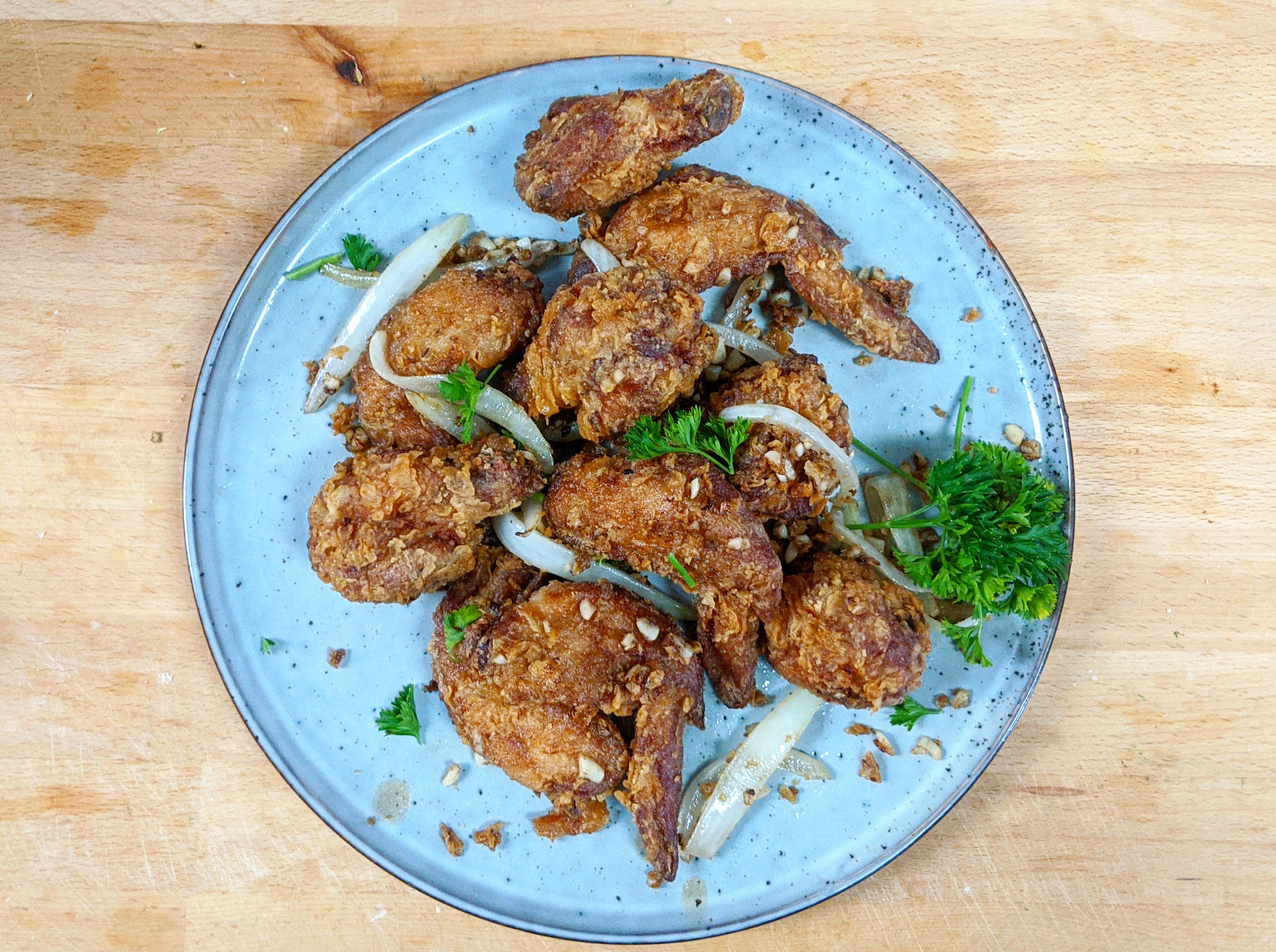 house chili sauce, Szechuan peppercorn, onions and peppers.